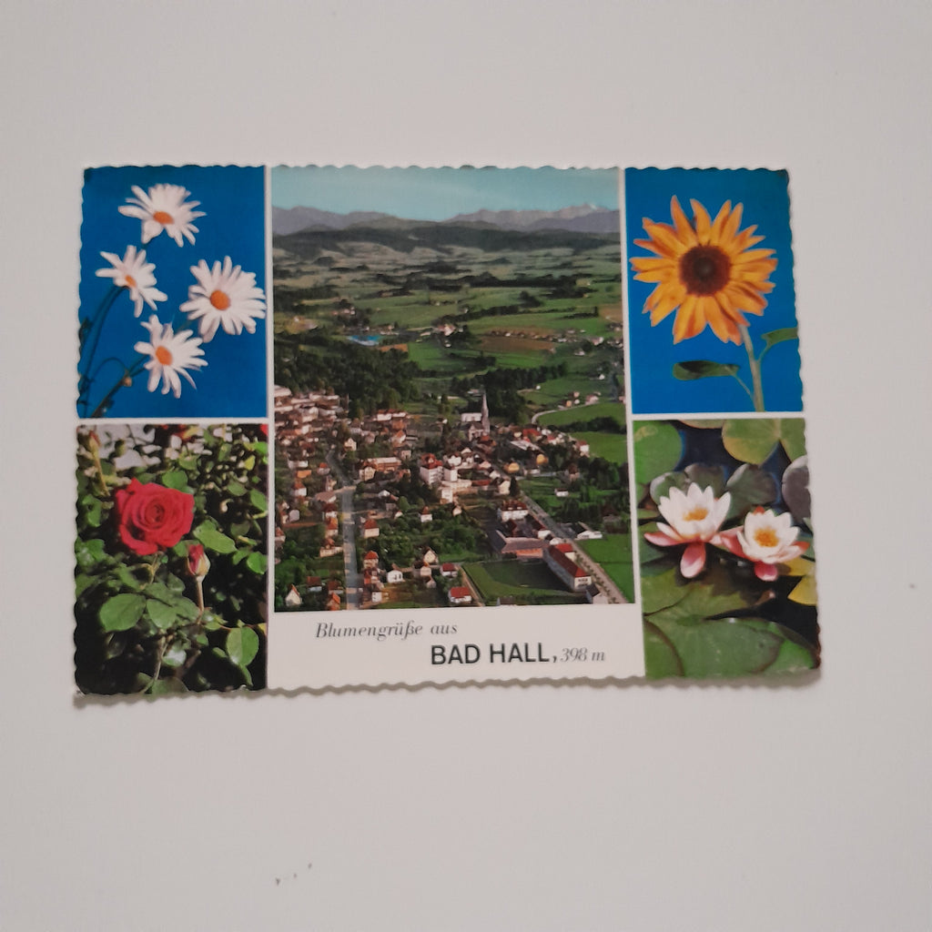 AK Blumengrüße aus Bad Hall. Gelaufen. Großformat. Verlag: Alpine Luftbild. Nummeriert: 58710 BI 2. Zustand: gut, linkes oberes Eck geknickt.