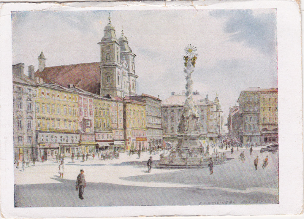 AK H...platz. Heimatwerk Oberdonau, E.V., Linz a.d. Donau. Kartenfolge VI: Linz a.d. Donau und Umgebung. Nummeriert: 1. Nach einem Aquarell von F.X. Weidinger, Bad Ischl.