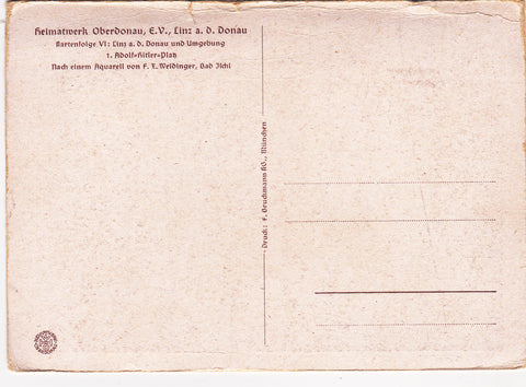 AK H...platz. Heimatwerk Oberdonau, E.V., Linz a.d. Donau. Kartenfolge VI: Linz a.d. Donau und Umgebung. Nummeriert: 1. Nach einem Aquarell von F.X. Weidinger, Bad Ischl. Ungelaufen. Großformat. Verlag: Bruckmann. Zustand: stark bestoßen mit Einrissen am oberen Rand.