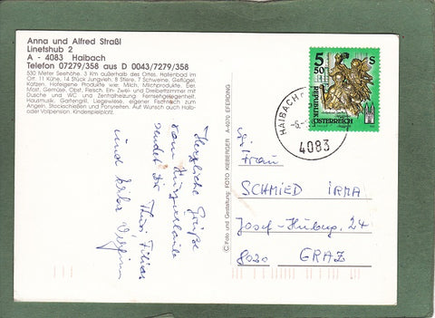 AK Haibach. Anna und Alfred Straßl Linetshub 2. Urlaub am Bauernhof. Gelaufen. Großformat. Verlag: Kieberger. Zustand: gut, untere Ecken und linkes oberes Eck leicht angeknickt.