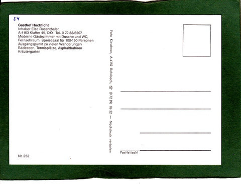 AK Klaffer 45. Gasthof Hochficht. Inhaber Elsa Rosenthaler. Ungelaufen. Großformat. Verlag: Kirschner. Nummeriert: 252. Zustand: gut, rechtes unteres Eck wenig angeknickt.