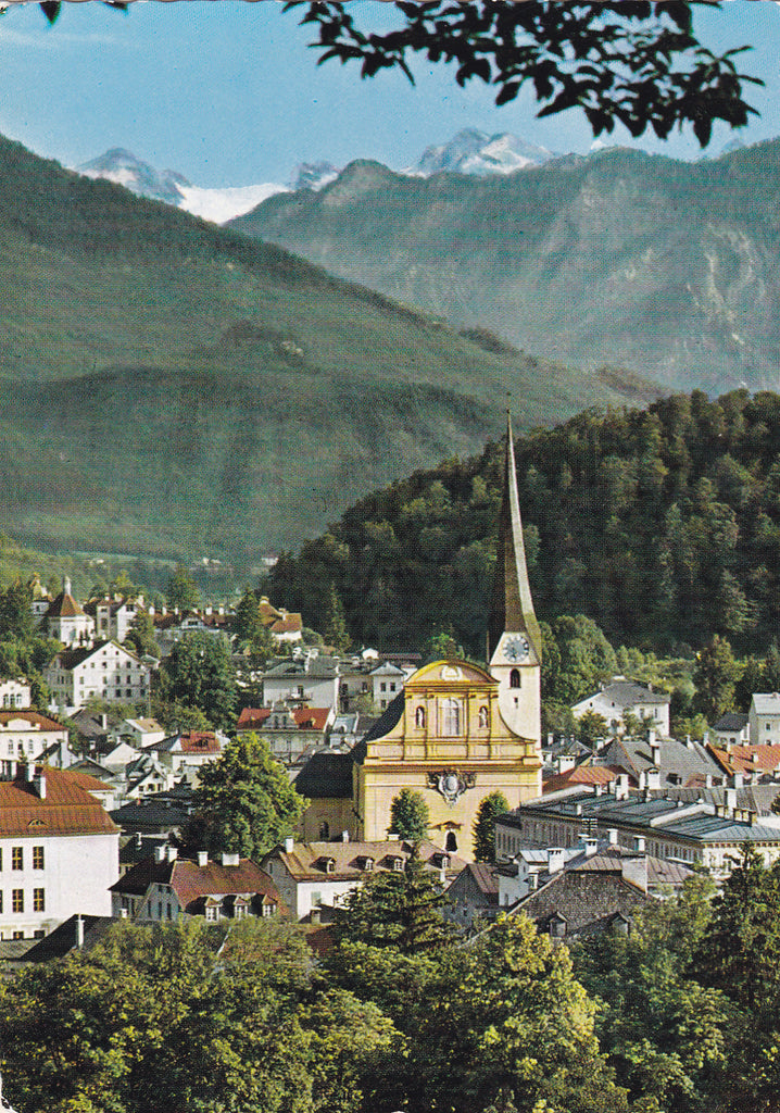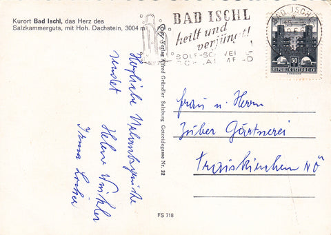 AK Kurort Bad Ischl mit Hoh. Dachstein. Gelaufen 1966. Großformat. Verlag: Cosy. Nummeriert: FS 718. Zustand: rechtes oberes und linkes unteres Eck geknickt.