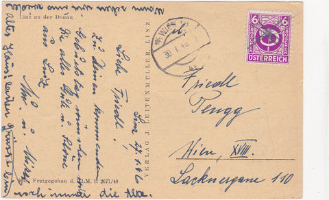 AK Linz a. d. Donau. Gelaufen 1946. Kleinformat. Verlag: Leitenmüller. Nummeriert: 6049. Zustand: kleiner Einriss am linken Rand, sonst O.k.
