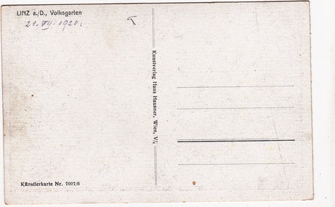 AK Linz a./D., Volksgarten. Ungelaufen. Kleinformat. Verlag: Hausner. Nummeriert: 7007/6. Zustand: Knick über der mittleren unteren Hälfte, Ecken leicht angestoßen.