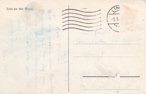 AK Linz an der Donau. Gelaufen, aber Briefmarke wurde entfernt. Kleinformat. Zustand: Kleberückstände auf Rückseite, linkes oberes Eck geknickt.