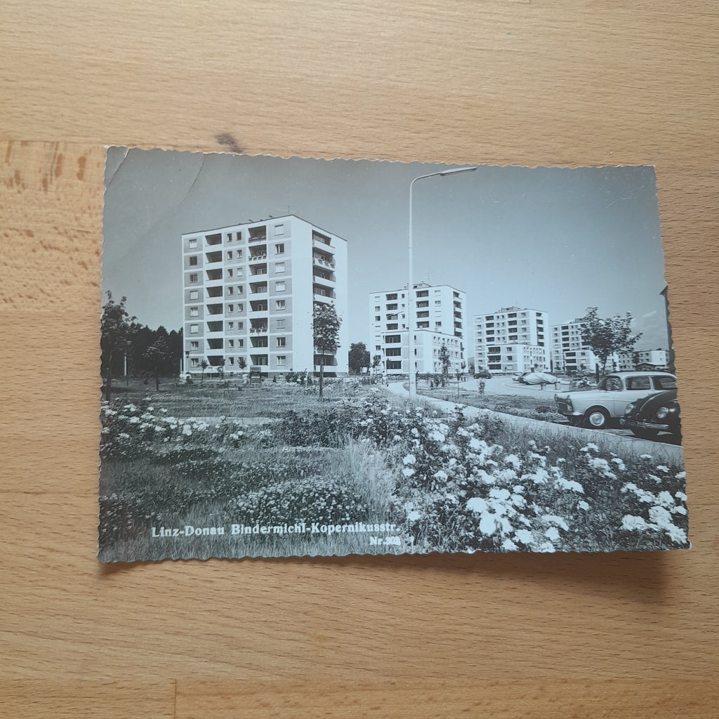 AK Linz. Bindermichl - Kopernikusstraße. Gelaufen, aber Briefmarke wurde entfernt. Großformat. Zustand: linkes oberes Eck geknickt.