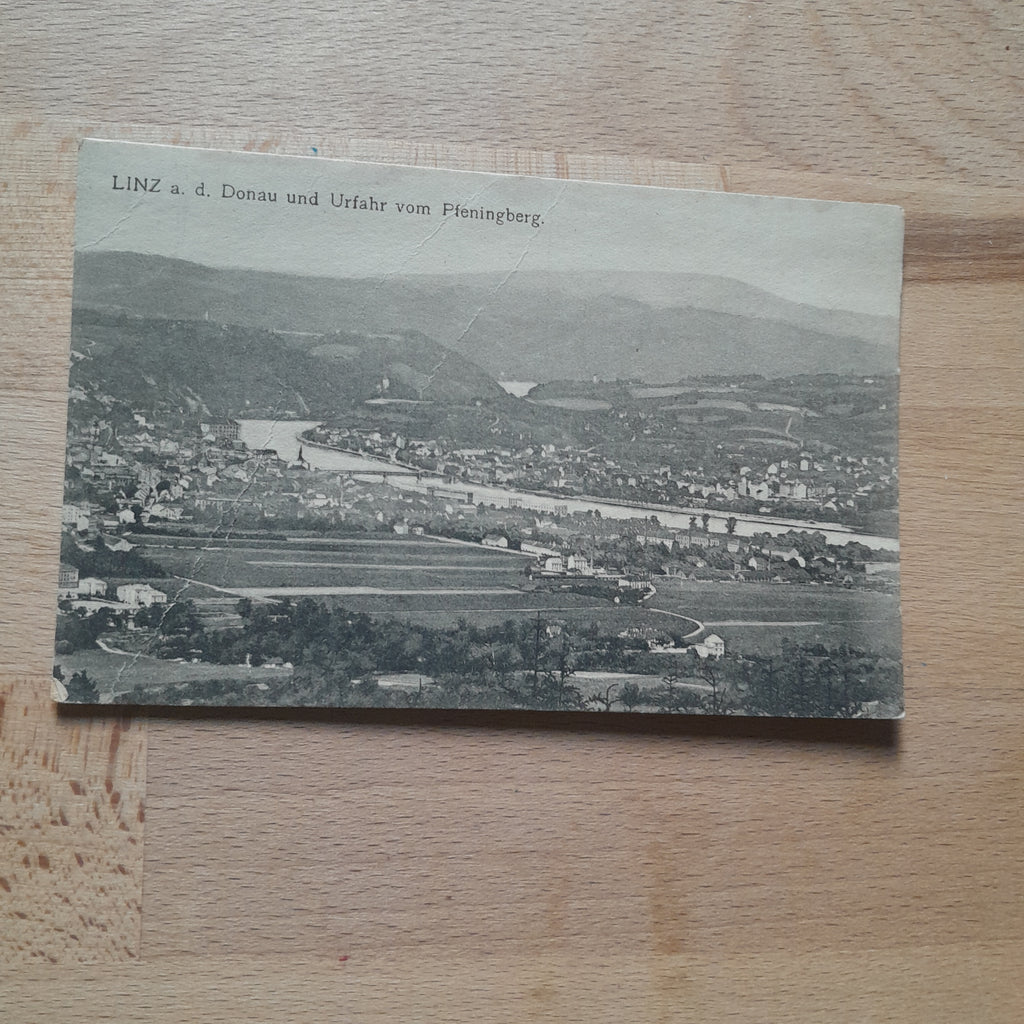 AK Linz und Urfahr vom Pfeningberg. Ungelaufen. Kleinformat. Zustand: stärker bestoßen.
