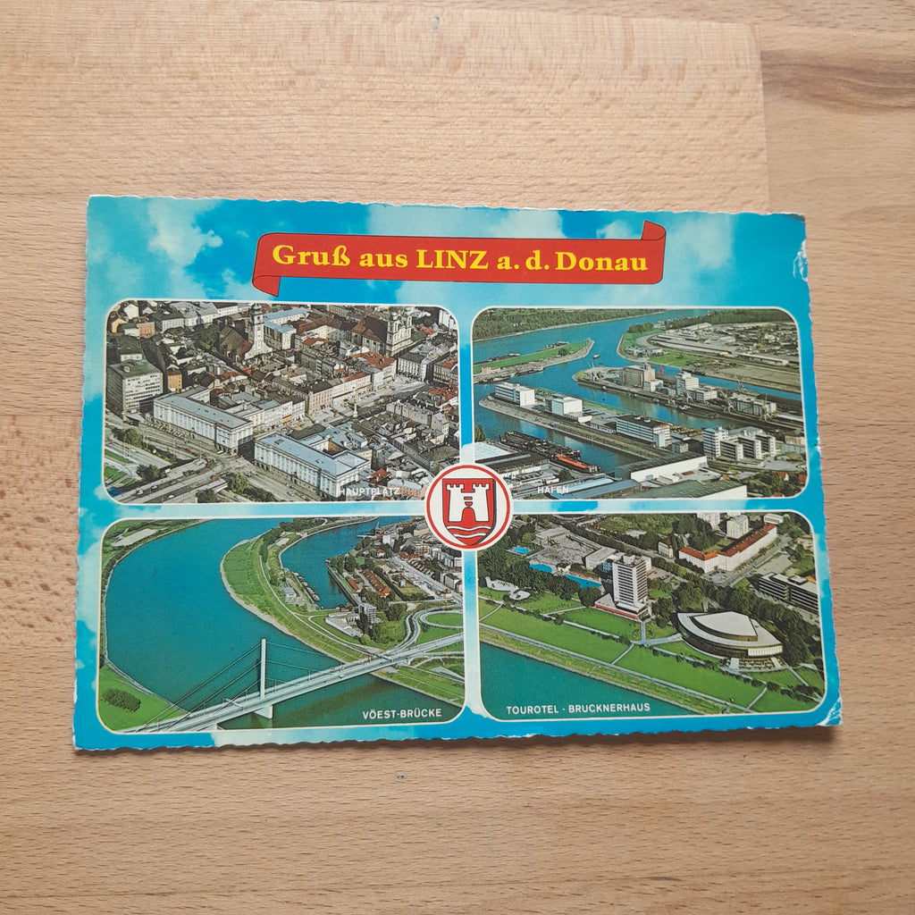 AK Gruss aus Linz. Gelaufen. Großformat. Verlag: Alpine Luftbild. Nummeriert: 909. Zustand: am rechten Rand und rechtes unteres Eck angeknickt.