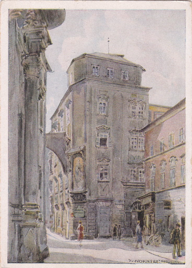 AK Pfarrplatz, Ecke Pfarrgasse. Barockes Bürgerhaus. Heimatwerk Oberdonau, E.V., Linz a.d. Donau. Kartenfolge VI: Linz a.d. Donau und Umgebung. Nummeriert: 3. Nach einem Aquarell von F.X. Weidinger, Bad Ischl.