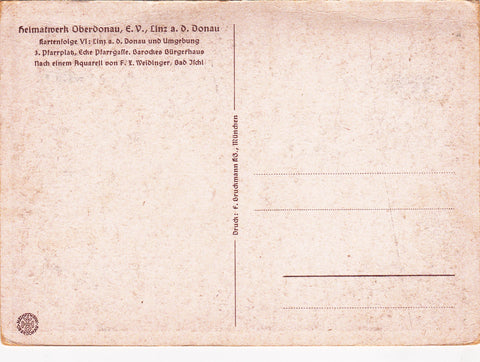 AK Pfarrplatz, Ecke Pfarrgasse. Barockes Bürgerhaus. Heimatwerk Oberdonau, E.V., Linz a.d. Donau. Kartenfolge VI: Linz a.d. Donau und Umgebung. Nummeriert: 3. Nach einem Aquarell von F.X. Weidinger, Bad Ischl. Ungelaufen. Großformat. Verlag: Bruckmann. Zustand: Ecken geknickt bzw. angeknickt.