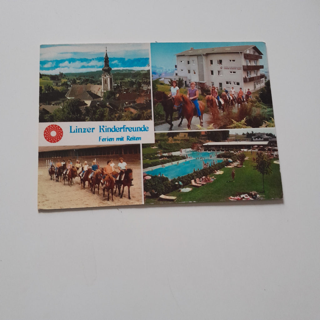AK Ampflwang im Hausruckwald. Linzer Kinderfreunde. Stefan Demuth Haus. Ferien mit Reiten. Gelaufen. Großformat. Verlag: Schachermaier. Nummeriert: 1285. Zustand: gut.