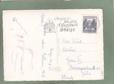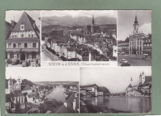AK Steyr a.d. Enns. Gelaufen. Großformat. Verlag: Ledermann. 1965. Zustand: untere Ecken angeknickt. Kleiner Fingerknick am unteren Rand etwas links der Mitte.
