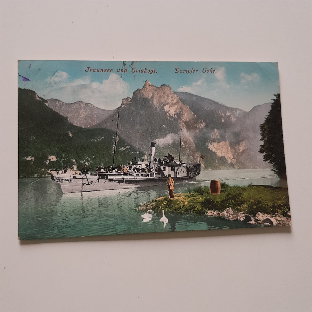AK Traunsee und Erlakogl. Dampfer Sofie. (1906) Gelaufen. Kleinformat. Verlag: Brandt. Nummeriert: 435. Zustand: gut.