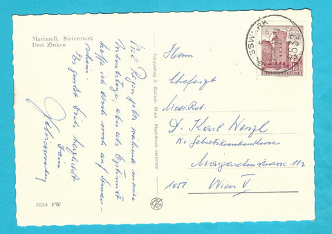 AK Mariazell. Drei Zinken. Gelaufen. Großformat. Verlag: Kellner. Nummeriert: 3654 FW. Zustand: gut, rechte Ecken angeknickt.