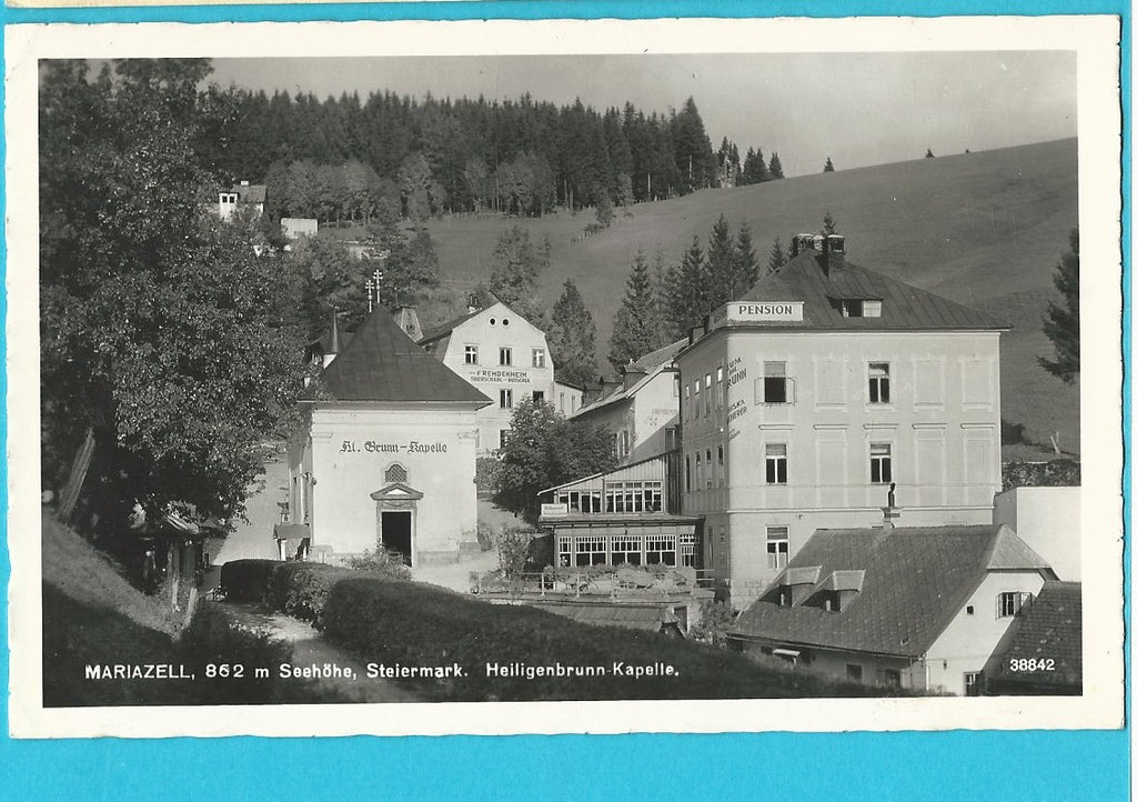 AK Mariazell. Heiligenbrunn Kapelle. Gelaufen. Kleinformat. Verlag: Ledermann. Nummeriert: 38842. Zustand: gut, linkes oberes Eck angeknickt.