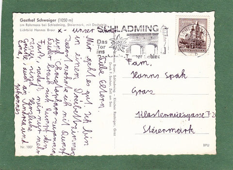 AK Rohrmoos bei Schladming, Gasthof Schwaiger. Gelaufen in Schladming. Großformat. Verlag: Hannes Broer. Nummeriert: 1007. Zustand: Ecken geknickt, Kugelschreiberkreuz ca. in Bildmitte.