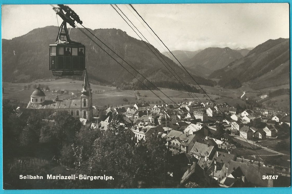 AK Seilbahn Mariazell-Bürgeralpe. Gelaufen, aber Briefmarke wurde entfernt. Kleinformat. Verlag: Ledermann. Nummeriert: 34747. Zustand: gut, linkes unteres Eck angeknickt.
