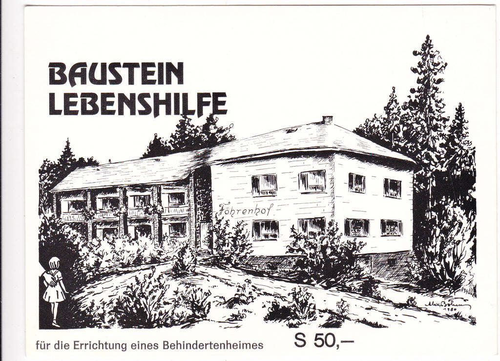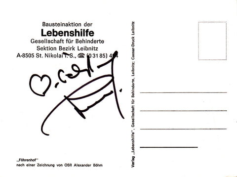 AK St. Nikolai im Sausal. Föhrenhof nach einer Zeichnung von OSR Alexander Böhm. Bausteinkarte. Ungelaufen. Großformat. Verlag: Lebenshilfe. Zustand: gut, linkes unteres Eck angeknickt.