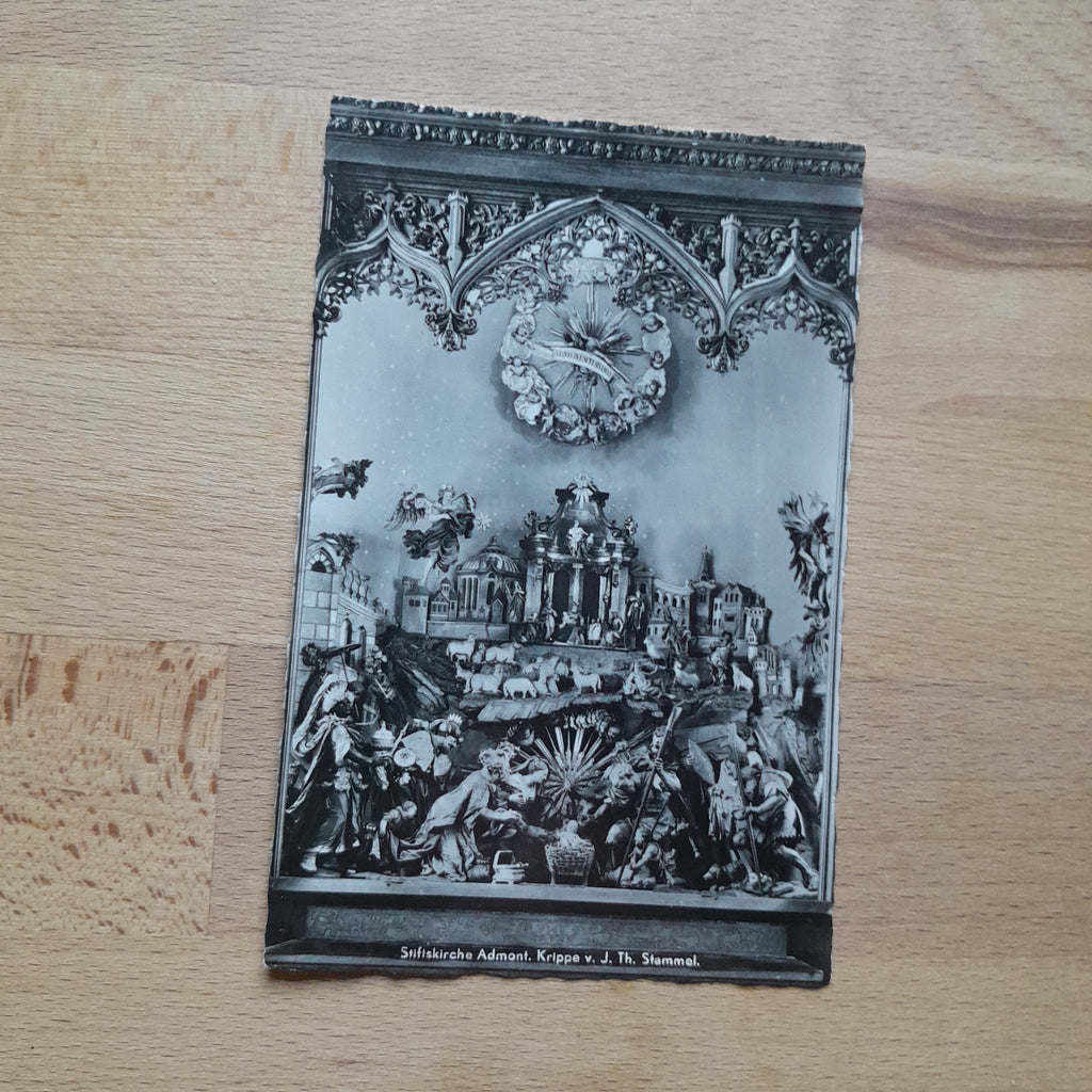 AK Stiftskirche Admont. Krippe v. J. Th. Stammel. Ungelaufen. Kleinformat. Verlag: Ledermann. Zustand: Kleberückstände an Rückseite.