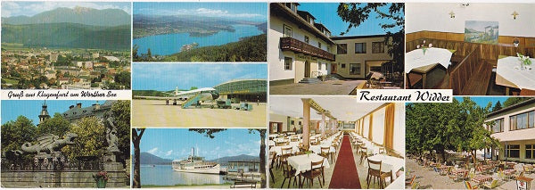 Doppel-Werbe-AK Hollenburg. Restaurant Widder. Gruß aus Klagenfurt am Wörther See. Großformat. Verlag: Mostegl. Nummeriert: 17/125. Zustand: gut.