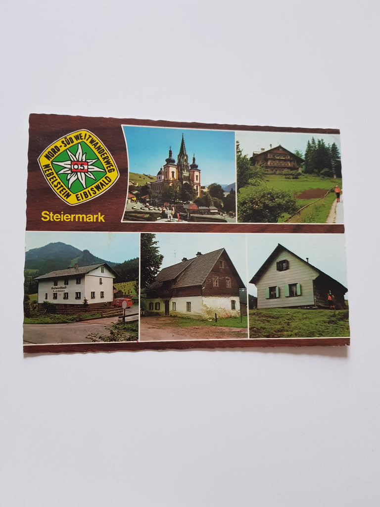 AK Nord-Süd Weitwanderweg Nebelstein - Eibiswald. Mariazell. Hotel Alpenhof, Gasth. Steinacher, Mooshuben, Schöneben, Herrenbodenalm auf dem Tonion. Gelaufen. Großformat. Verlag: Hruby. Nummeriert: 7163. Zustand: gut, leicht bestoßen.