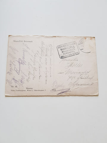 AK Mariazell. (1928) Gelaufen, aber Briefmarke wurde entfernt. Kleinformat. Verlag: Nachbargauer. Nummeriert: 41. Zustand: stärker bestoßen.
