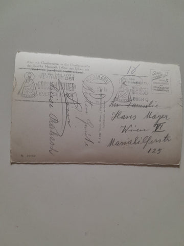 AK Altar mit Gnadenmutter in der Gnadenkapelle der Basilika Mariazell. Gelaufen, aber Briefmarke wurde entfernt. Kleinformat. Verlag: Ledermann. Nummeriert: 43262. Zustand: leicht bestoßen.