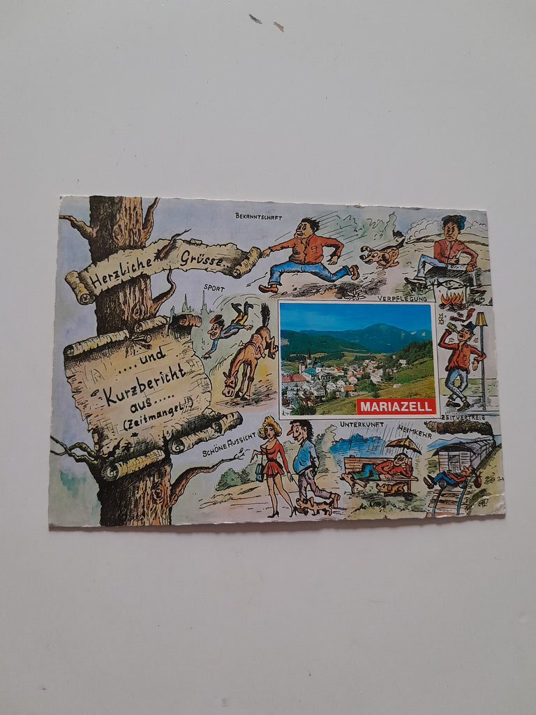 AK Mariazell. Herzliche Grüsse und Kurzbericht aus Zeitmangel. Gelaufen. Großformat. Verlag: Alpenland. Nummeriert: 1367. Zustand: rechte Ecken und am rechten Rand geknickt.