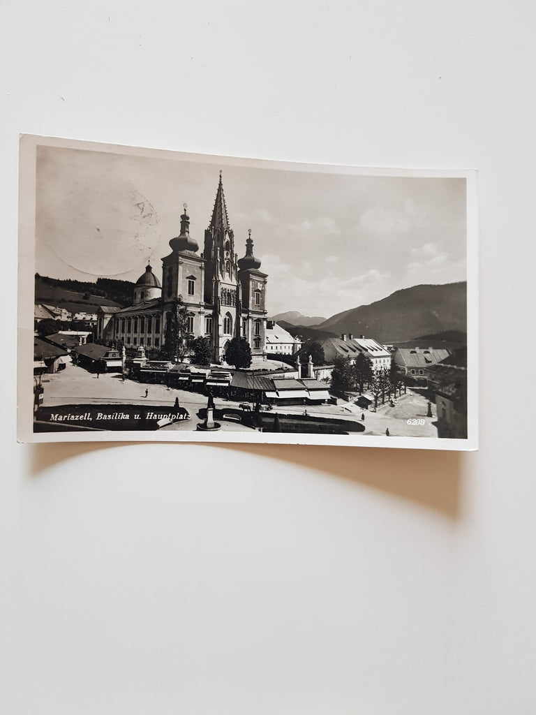 AK Mariazell. Basilika und Hauptplatz. (1939) Gelaufen. Kleinformat. Verlag: Radinger. Nummeriert: 6203. Zustand: gut.