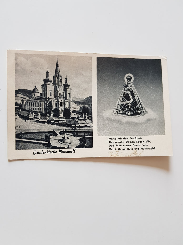 AK Mariazell. Gelaufen, aber Briefmarke wurde entfernt. Kleinformat. Verlag: Ledermann. Nummeriert: 40145. Zustand: obere Ecken geknickt, sonst leicht fleckig.