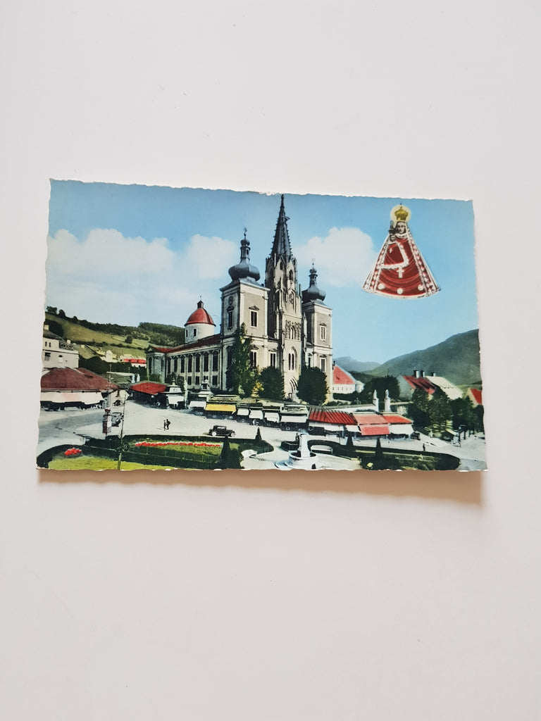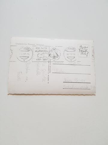 AK Mariazell. Gelaufen, aber Briefmarke wurde entfernt. Kleinformat. Verlag: Ledermann. Nummeriert: 50053. Zustand: stark knittrig.