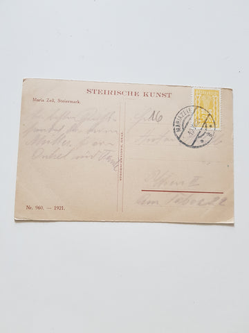 AK Mariazell. (1921) Gelaufen. Kleinformat. Verlag: Strohschneider. Nummeriert: 960. Zustand: Ecken etwas angestoßen bzw. mit Steckalbumdruckspuren.