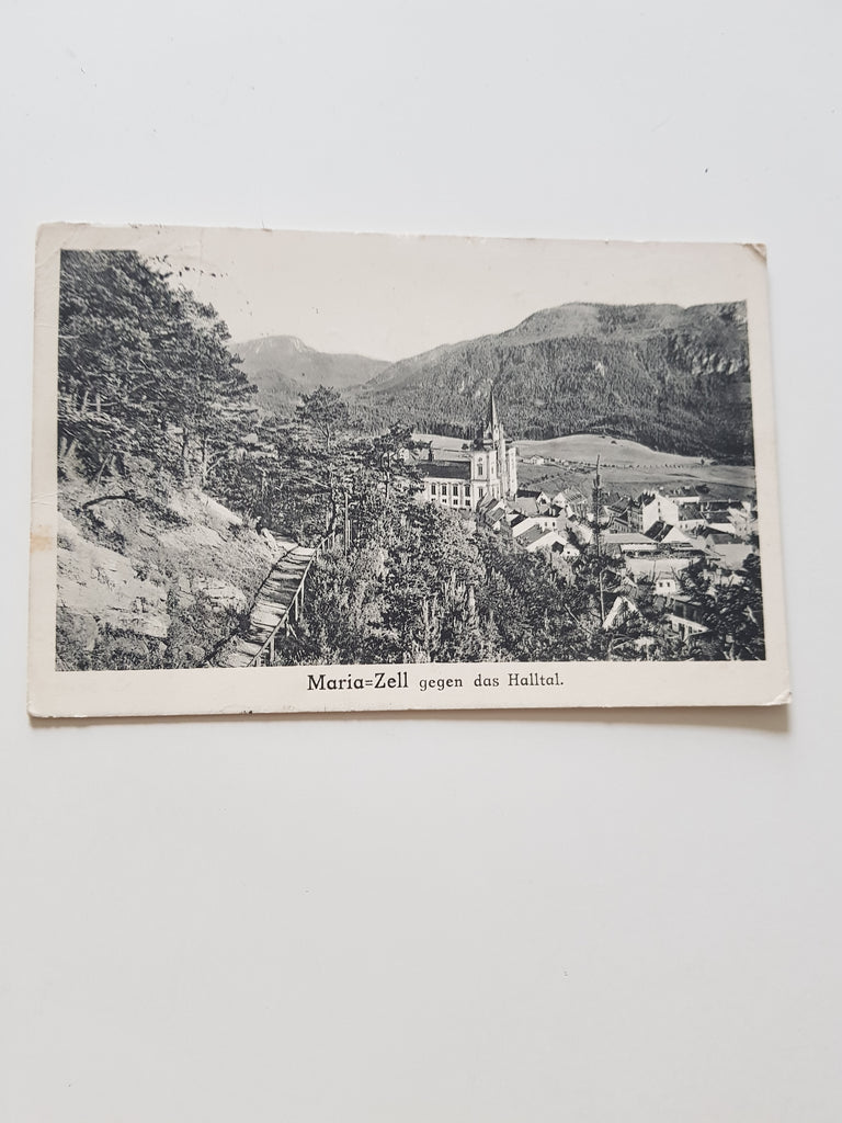 AK Mariazell gegen das Halltal. (1914) Gelaufen, aber Briefmarke wurde entfernt. Kleinformat. Verlag: Kilophot. Nummeriert: 20153. Zustand: Ecken geknickt bzw. angeknickt.