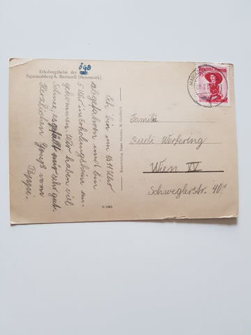 AK Erholungsheim Sigmundberg bei Mariazell. Gelaufen. Großformat. Zustand: obere Ecken geknickt, am unteren Rand etwas bestoßen.