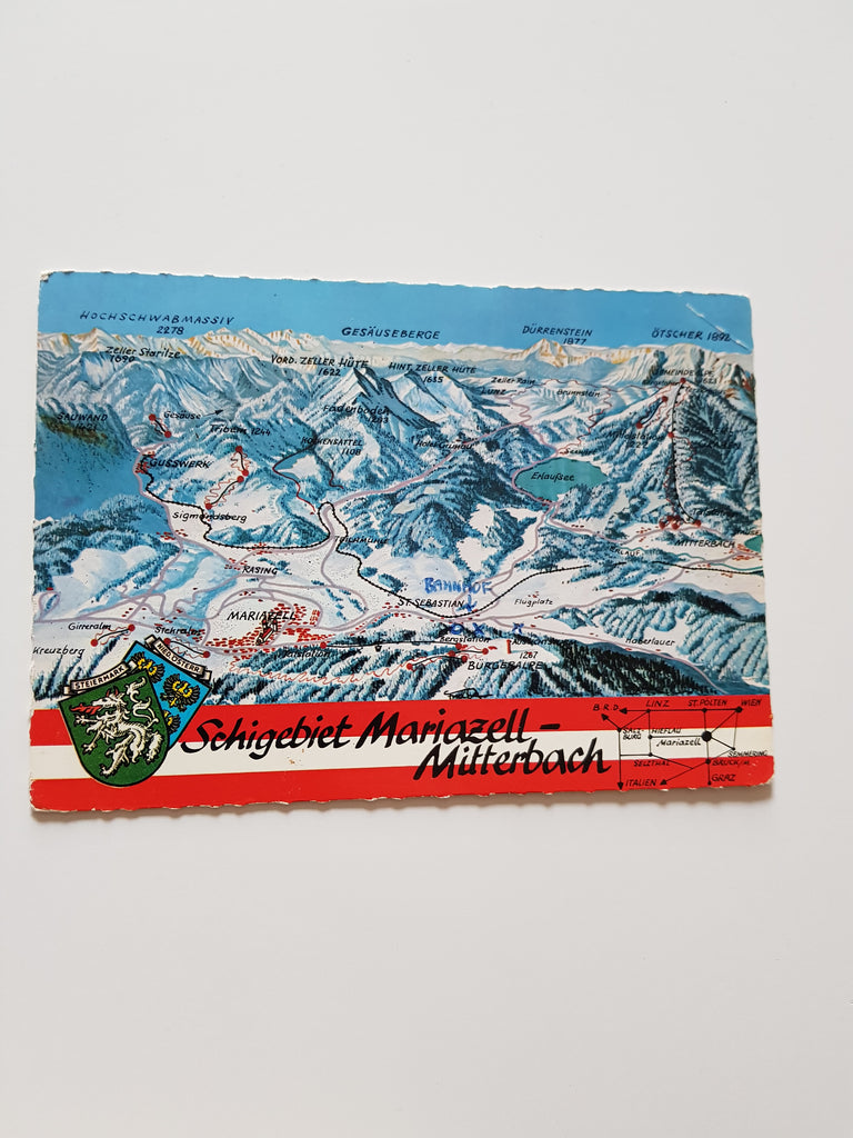 AK Schigebiet Mariazell - Mitterbach. Gelaufen. Großformat. Verlag: Kellner. Nummeriert: 1598. Zustand: stärker bestoßen.