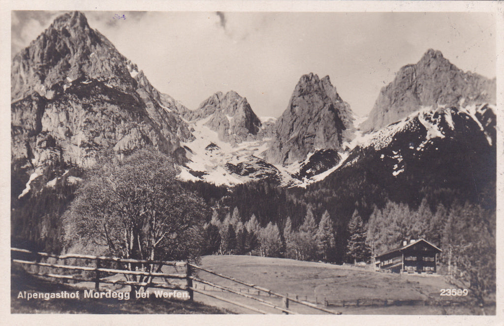 AK Alpengasthof Mordegg bei Werfen. (1928) Gelaufen. Kleinformat. Verlag: Ledermann. Nummeriert: 23589. Zustand: gut, wenig bestoßen.