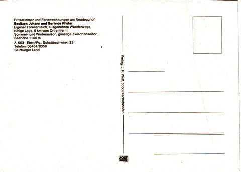 AK Eben im Pongau. Schattbachwinkl 32. Neudegghof. Besitzer: Johann und Gerlinde Pfister. Ungelaufen. Großformat. Verlag: Wolf. Zustand: gut.