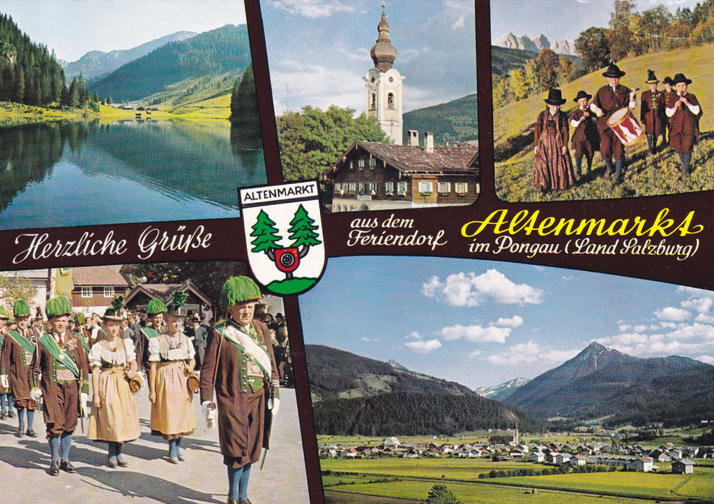 AK Herzliche Grüße aus dem Feriendorf Altenmarkt im Pongau. Gelaufen. Großformat. Verlag: Broier. Nummeriert: 180. Zustand: rechtes oberes Eck geknickt, sonst O.k.