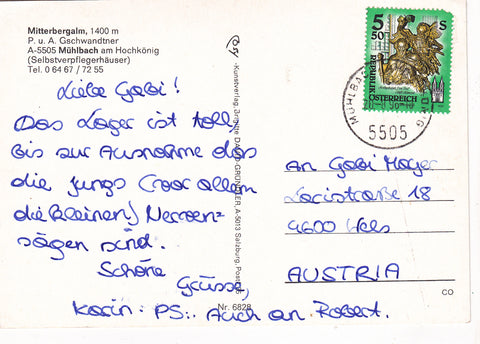 AK Mitterbergalm. P. u. A. Gschwandtner. Mühlbach am Hochkönig (Selbstverpflegerhäuser). Gelaufen. Großformat. Verlag: Cosy. Nummeriert: 6828. Zustand: obere Ecken angeknickt, sonst O.k.