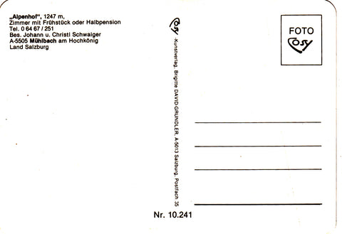 AK Mühlbach am Hochkönig. Pension Alpenhof. Bes. Johann u. Christl Schwaiger. Ungelaufen. Großformat. Verlag: Cosy. Nummeriert: 10241. Zustand: gut.
