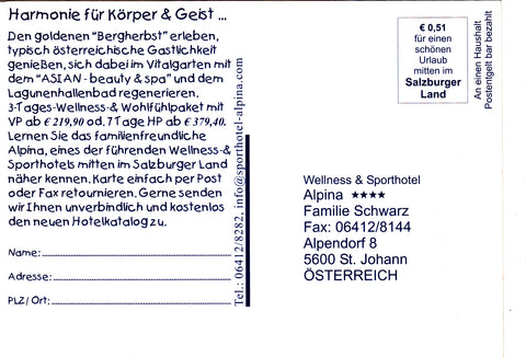 Werbe-AK St. Johann im Pongau. Wellness & Sporthotel Alpina Familie Schwarz. Ungelaufen. Großformat. Zustand: gut, leicht bestoßen.