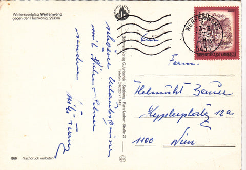 AK Werfenweng gegen den Hochkönig. Gelaufen 1978. Großformat. Verlag: Juritschek. Nummeriert: 866. Zustand: Ecken angeknickt bzw. geknickt.