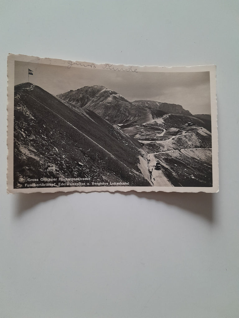 AK Grossglockner Hochalpenstrasse. Fuschertörlkopf, Edelweisspitze und Berghaus Lukashansl. (1935) Gelaufen. Kleinformat. Verlag: Jurischek. Nummeriert: 21773. Zustand: gut.