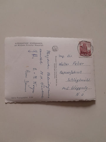 AK Alpengasthof Schönangerl am Mittleren Krimmler Wasserfall.Gelaufen. Großformat. Verlag: Jurischek. Nummeriert: 94. Zustand: gut, linkes unteres Eck geknickt.