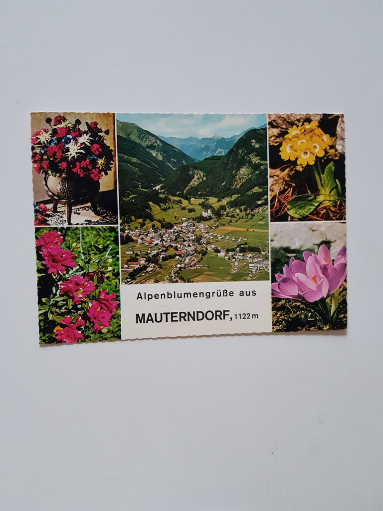 AK Alpenblumengrüße aus Mauterndorf. Gelaufen. Großformat. Verlag: Alpine Luftbild. Nummeriert: FÖ 53153 BI 1. Zustand: gut, linkes oberes Eck geknickt.