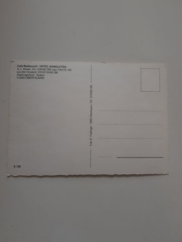 AK Obertauern. Cafe-Restaurant Hotel Gamsleiten. A. L. Waser. Ungelaufen. Großformat. Verlag: Thallinger. Nummeriert: A 136. Zustand: Knick über dem rechten unteren Eck.