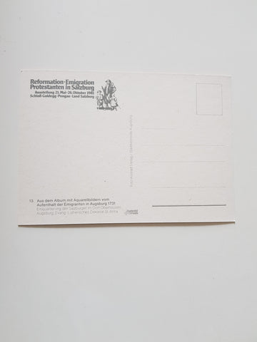 AK Schloß Goldegg. Reformation Emigration Protestanten in Salzburg. Ausstellung 1981. 13. Aus dem Album mit Quarellbildern vom Aufenthalt der Emigranten in Augsburg 1731. Ungelaufen. Großformat. Zustand: gut.