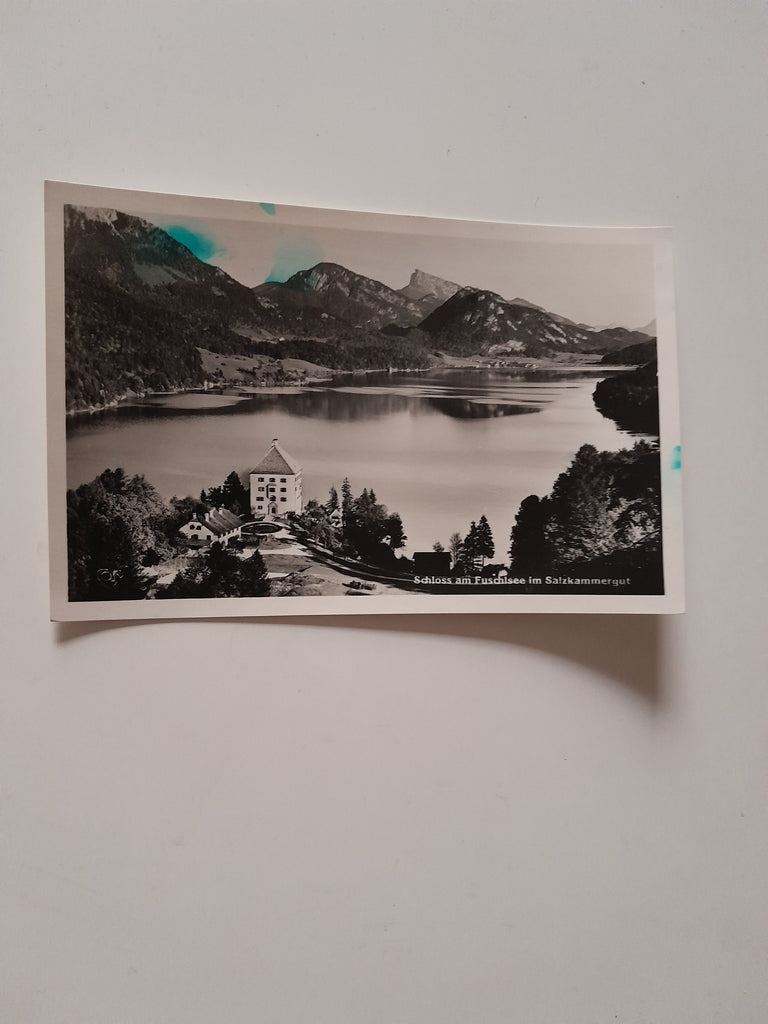 AK Schloss am Fuschlsee. Gelaufen, aber Briefmarke wurde entfernt. Kleinformat. Verlag: Cosy. Zustand: Tintenfleckig.