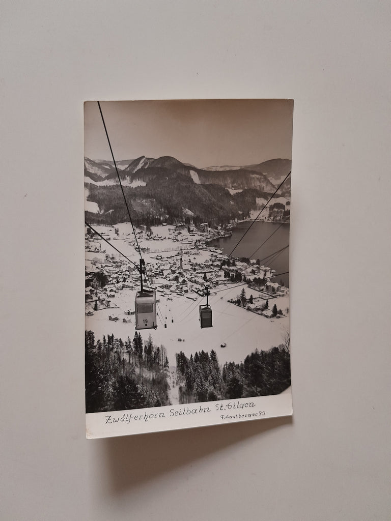 AK St. Gilgen am Wolfgangsee. Zwölferhorn Seilbahn. Gelaufen, aber Briefmarke wurde entfernt. Kleinformat. Verlag: Gastberger. Nummeriert: 90. Zustand: gut.