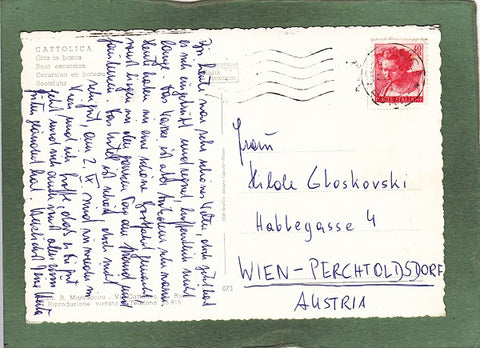 AK Cattolica. Gita in barca. Gelaufen 1962. Großformat. Verlag: Marcaccini. Nummeriert: 073. Zustand: am rechten kleiner Einriß 2mm, sonst leichte Läsuren an Ecken.